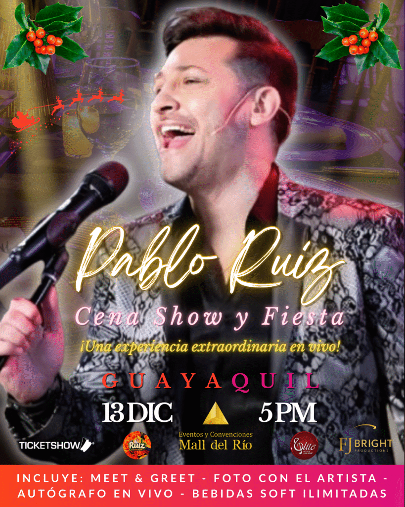 Cena Navideña 2025 en Guayaquil: Un Evento Único con Pablo Ruiz🎤 Cena Show Navideña con Música en Vivo🍽️ Menú Navideño Tradicional con Pavo, Cerdo y Postre📍 Lugar exclusivo en Guayaquil🎟️ Compra tus entradas con anticipación⭐ ¿Por qué elegir nuestra Cena Navideña 2025?GYE. SÁB. 13 DIC. 17H00¡Adquiere hoy tu entrada y ven a disfrutar junto a Pablo Ruiz esta Cena Show y Fiesta inolvidable!¡Últimos cupos disponibles aquí!: Tu navegador no soporta el elemento de audio.